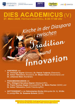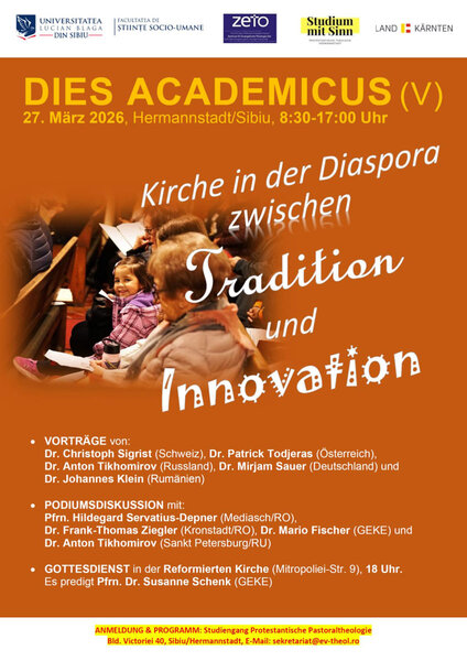 Hermannstadt – Am Freitag, 27.3., findet um 8.30 Uhr im Theologischen Institut in Hermannstadt/Sibiu (Schewisgasse/Bld. Victoriei Nr. 40) der jährliche Dies Academicus statt. Die von dem Zentrum für Evangelische Theologie Ost (ZETO) und dem Theologischen Institut an der Lucian-Blaga-Universität organisierte Tagung steht unter dem Titel: „Brannte nicht unser Herz in uns? (Lk 24,32) Kirche in der Diaspora zwischen Tradition und Innovation“. Zum Programm gehören Vorträge zu folgenden Themen: Von brennenden und hörenden Herzen. Diakonie in der Diaspora Schweiz zwischen Tradition und Innovation (Christoph Sigrist – Schweiz), Vital trotz widriger Umstände (Patrick Todjeras – Österreich), Spielend glauben, handelnd hoffen – Die Kinderuni Bekokten als Raum evangelischer Bildung (Johannes Klein – Rumänien), Tradition: ein verwirrter und ein verwirrender Begriff. Erfahrung aus der ELK Russlands (Anton Tikhomirov – Russland). Auf die Vorträge folgt eine von Thomas Pitters moderierte Podiumsdiskussion. Abgeschlossen wird das Programm mit einem Festgottesdienst um 18 Uhr in der Reformierten Kirche in Hermannstadt, im Rahmen dessen die Generalsekretärin der Gemeinschaft der Evangelischen Kirchen in Europa (GEKE) Susanne Schenk die Predigt übernehmen wird. Im Anschluss an den Gottesdienst findet ein Empfang im Gemeinderaum der reformierten Gemeinde statt. Die Teilnahme an der Tagung und dem Festgottesdienst ist kostenlos und offen für alle Interessierten. Um Anmeldung wird unter sekretariat@ev-theol.ro gebeten. Die Tagung wird finanziell vom Bundesland Kärnten unterstützt.