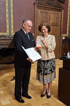 Gratuliert hat die österreichische Botschafterin sodann dem Abgeordneten-„Triumvirat“ Ovidiu Ganț, Silviu Vexler und Slavoliub Adnagi – die beiden Parlamentskollegen waren zugegen – für das Gesetz, aufgrund dessen die Geschichte des Holocaust als Pflichtfach in den Lehrplan aufgenommen worden ist, was sie als „Meilenstein und wichtiges Zeichen gegen das Vergessen“ aber auch „Intoleranz und Antisemitismus in jeder Form des historischen Revisionismus“ bezeichnete. Die Auszeichnung erhalte MP Ganț für jahrzehntelange Dienste im österreichisch-rumänischen Dialog, in dem er stets betont habe, dass kulturelle Vielfalt keine Belastung sei und auf die gemeinsamen Wurzeln und Verbindungen zwischen dem Banat und dem mitteleuropäischen Raum „als fruchtbarem Boden für gegenseitiges Verständnis, Respekt und Kooperation“ hingewiesen hat. Vor der Überreichung der Auszeichnungs-Urkunde und des Ehrenzeichens händigte die Botschafterin dem Geehrten ein Schreiben von Beate Meinl-Reisinger, der österreichischen Bundesministerin für europäische und internationale Angelegenheiten, aus.