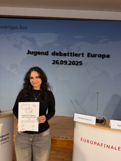 Ein hervorragender Erfolg für die Deutsche Spezialabteilung des Nikolaus-Lenau-Lyzeums Temeswar. Zara Chișevescu, Schülerin der 11. MI-Klasse, hat das Europafinale des Wettbewerbs „Jugend debattiert international” in Berlin gewonnen.