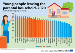 Im EU-Schnitt ziehen junge Menschen mit 26,4 Jahren von Zuhause aus, in Rumänien mit 27,9 Jahren. Deutlich ist das Nord-Süd-Gefälle: In Schweden etwa ziehen Jugendliche mit bereits 17,5 Jahren aus, in den skandinavischen Ländern sowie Deutschland, Estland und Luxemburg liegt der Schnitt bei unter 24 Jahren. Am längsten warten junge Erwachsene dagegen in Kroatien (32,4 Jahre), in allen Mittelmeerländern liegt das Alter über dem EU-Schnitt.
