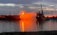 Bukarest (ADZ) – Die rumänischen Behörden haben am frühen Dienstagmorgen eine Teilentwarnung zur Explosionsgefahr bei einem brennenden Schiff nahe der Gemeinde Ceatalchioi und des Dorfs Plauru im Landeskreis Tulcea gegeben. Ukrainische Einsatzkräfte hatten in der Nacht ein großes Löschschiff nach Ismail verlegt, das große Mengen Wasser auf die „Orinda“ sprüht, um brennende Tanks abzukühlen. Das Schiff unter türkischer Flagge mit 4400 Tonnen Flüssiggas (LPG) war in der Nacht zu Montag bei einem Angriff mit russischen Drohnen auf ukrainische Ziele in der Nähe des Donauhafens Ismail getroffen worden. Nach Angaben der türkischen Seebehörde geriet das Schiff beim Verlassen des Hafens von Ismail unter Beschuss und fing Feuer. Die Besatzung wurde unverletzt in Sicherheit gebracht.