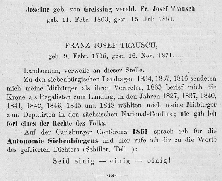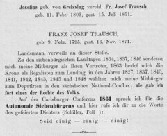 Franz Josef Trausch stirbt im Jahr 1871 und wird in der Familiengruft Innere Stadt A8 bestattet. Seine Frau war schon 20 Jahre vorher in Borsec gestorben und wurde später auch in diese Gruft überführt. Desgleichen wurden in dieser Gruft auch sein Vater Johann Trausch, gestorben 1831 in Neustadt und seine Mutter 1856 bestattet.