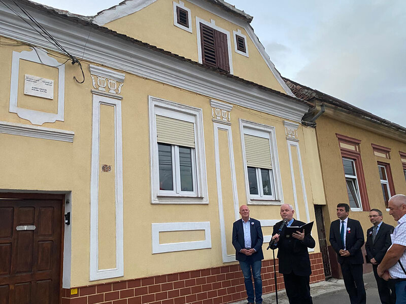 Albert Ziegler wurde am 9. April 1888 in diesem Haus als Sohn eines Bauern geboren. Bereits als Kind träumte er vom Fliegen, erzählt Rainer Lehni, Bundesvorsitzender des Verbandes der Siebenbürger Sachsen in Deutschland in seinem Vortrag. Nachdem er den Beruf des Mechanikers erlernt hatte, ging er in die Schweiz, nach Frankreich, England und Deutschland, um seine Kenntnisse über Motoren, Flug und Funktechnik zu vertiefen. 1913 kehrte er nach Siebenbürgen zurück und absolvierte Schauflüge mit seinem selbstgebauten Eindecker: am 19. Oktober auch über Zeiden. Bis zum Juni 1914 ist Albert Ziegler 90 Mal vom Boden abgehoben. Mehr über diesen Flugpionier kann man im Zeidener Stadtmuseum erfahren.