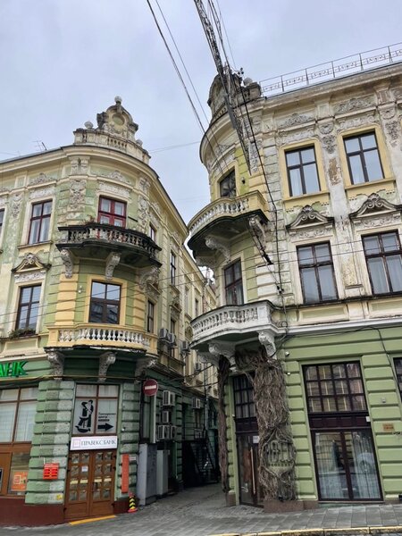Auf dem historischen Kopfsteinpflaster der ehemaligen Herrengasse, dessen Ursprung teils auf die k.u.k.-Zeit zurückgeht, erreicht man entlang prächtiger Jugendstilfassaden das Deutsche Haus. Die Kastanien-, Platanen- und Maulbeerbäume, die ich bei meinem letzten Besuch vor über fünfzehn Jahren sah, sind inzwischen verschwunden. Auch die früher mit schwarzen Steinen eingefassten Bordsteine mit Stadtnamen in fünf Sprachen (Czernowitz, Cernăuți, Cernovcy, Cernyvci, Tschernowitz) sind nicht mehr vorhanden. Das Wiener Café, einst beliebter Treffpunkt für Sachertorte und Melange, ist jetzt geschlossen. Auch die markanten Bukowina-Frauenköpfe an vielen Häusern, der Doppeladler und der moldauische Auerochse an Toren und Fassaden, die früher beleuchtet waren, sind nicht mehr so zahlreich. Das Celan-Literaturhaus kündigt zwar Lesungen ukrainischer Autoren im Schaufenster an, doch Hinweise auf ein aktives literarisches Leben im Inneren fehlen.