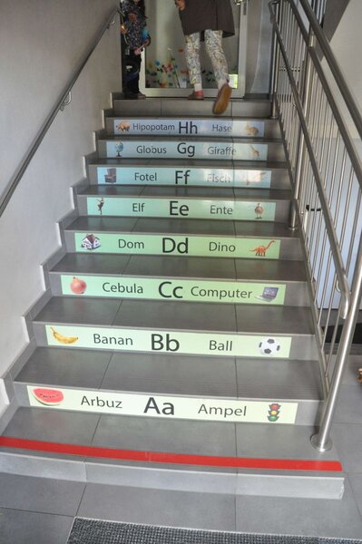 „Bei uns gibt es sechs Stunden Unterricht in Deutsch als Sprache, und auch in den übrigen Stunden versuchen wir, das Deutsche im Unterricht immer im Bewusstsein zu behalten“, erläutert Martina Osuchowski, die Vorsitzende des Vereins Kreativer Bildung, des Trägers der Einrichtung. Das ist nicht zu übersehen: An den Treppenstufen, auf den Wänden, in den Regalen mit dem Lehrmaterial – überall sind deutsche Wörter und ihre polnischen Entsprechungen zu sehen. 55 Kinder werden im Kindergarten an die deutsche Sprache herangeführt, 92 Schülerinnen und Schüler besuchen die achtklassige Grundschule, in der in beiden Sprachen gelernt wird.
