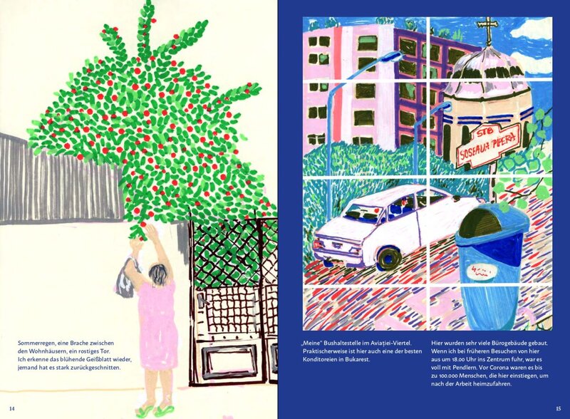 Dabei fängt das Buch ganz persönlich an: „Endlich. Meine erste längere Reise nach Bukarest seit der Pandemie. (…) Bei der Ankunft entdecke ich die leuchtende neue S-Bahnstation OTOPENI am Flughafen. Wie gut, ich muss nicht mehr mit dem Bus in die Stadt.“ Daneben gibt es ein Bild von genau dieser Station. Das Buch behauptet, wie der Titel schon sagt, ein Tagebuch zu sein. Das heißt, man folgt einer Erzählerin durch die Stadt, die sie bereist.