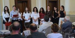 Das Finale des Workshops gehörte Evelin Per{enea, Teodora Bocu], Taina Presăcan, Ruxandra Mihai, Sofia Imb²ru{, Ana Cazan, Anda Brode]chi, Sofia Modrescu und Annemarie Lutsch, die als aktuelle Schülerinnen des Brukenthal-Gymnasiums zwölf Jugendgedichte von Gusto Gräser lesend rezitierten. Dass man ihren rumänischen Akzent werde hören können, hatte Monika Hay vorausgeschickt. Gemessen an der schwierigen Sprache Gräsers aber glückte ihnen der Auftrag mehr als passabel, wofür es nicht allein Applaus und kleine Erinnerungs-Präsente gab, sondern auch ein Gespräch mit den Jugendlichen über die Erarbeitung des Vorgetragenen. Ohne dass sie wie schulmeisterisch Rede und Antwort zu stehen hatten. „Das hat der Herr Gusto richtig toll gemacht!”, schloss kühn eine Schülerin. „Wollten keinen frischen Knaben, wollten einen feigen Knecht.”