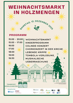 Angeboten werden regionale Produkte aus dem Harbachtal/Valea Hârtibaciului, ein Kinderprogramm (von 15 bis 17 Uhr), ein Weihnachtsliederkonzert (um 16 Uhr) und ein Chorkonzert in der Evangelischen Kirche Holzmengen (um 17 Uhr). Ab 18 Uhr ist eine lebende Krippe zu sehen; ab 19 Uhr beginnt die Tombola-Verlosung, um 19.30 Uhr erwartet die Besucherinnen und Besucher eine musikalische Überraschung.