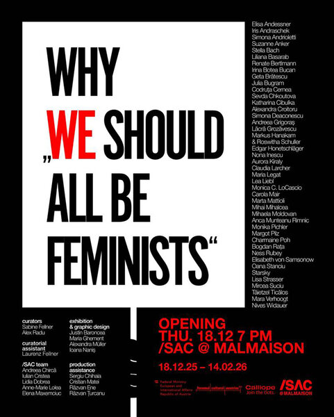 Bukarest (ADZ) – Nach dem Erfolg der Ausstellung „Touch Nature“ im Jahr 2024 bringen die Kuratoren Sabine Fellner und Alex Ion Radu die Werke von 44 renommierten Künstlern aus Rumänien und Österreich in einem neuen Großprojekt zusammen, das Tabus in Stücke reißt. Die Ausstellung „Why ‚We Should All Be Feminists’“ (Warum „Wir alle Feministinnen/Feministen sein sollten“) ist ein Plädoyer – natürlich unvollständig, aber demokratisch und entpolarisierend – für eine Veränderung der Art und Weise, wie wir gewohnt sind, auf alte soziale Dynamiken zu reagieren und neue zu konstruieren. Die Ausstellung kann vom 18. Dezember bis zum 14. Februar 2026 (Vernissage am 18. Dezember um 19 Uhr) im /SAC @ Malmaison (Calea Plevnei 137C) besucht werden. Die Ausstellung „Why ‚We Should All Be Feminists’“ wird von /SAC – Spațiul de Artă Contemporană (Raum für zeitgenössische Kunst) und dem Österreichischen Kulturforum mit Unterstützung des österreichischen Bundesministeriums für europäische und internationale Angelegenheiten im Rahmen des Programms „Calliope. Join the Dots“ organisiert.