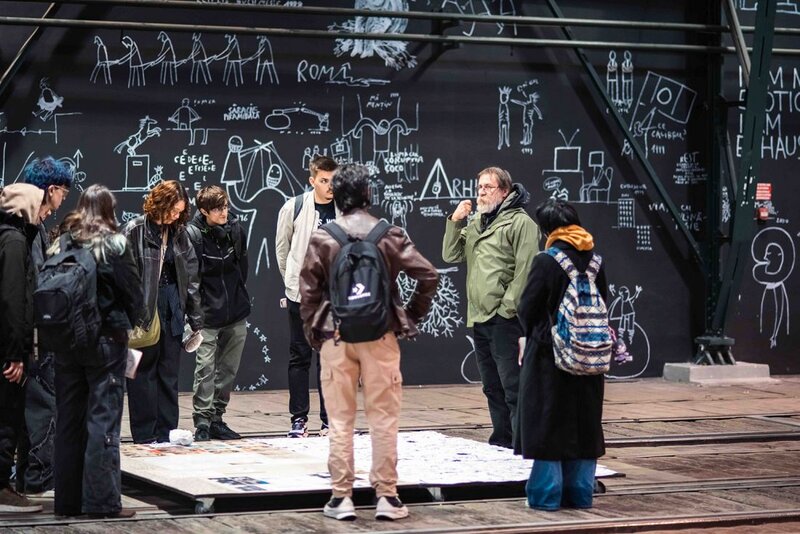 In der alten Straßenbahnhalle von Temeswar/Timișoara hört man statt dem Geräusch von Rädern auf Schienen das leise Rascheln von Markern. An den Wänden entsteht in Echtzeit die Geschichte von vier Jahrzehnten eines Künstlers in engem Zusammenhang mit der Geschichte eines Landes. Im in einen Kunstraum verwandelten Depot des Museums für öffentlichen Verkehr „Corneliu Miklosi“ zeichnet Dan Perjovschi sein Leben. 40 Jahre Zeichnung, Presse, Bürgersinn, Land – „Dan Perjovschi. Rumänien 1985–2025. Eine Retrospektive“.