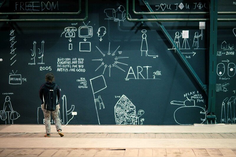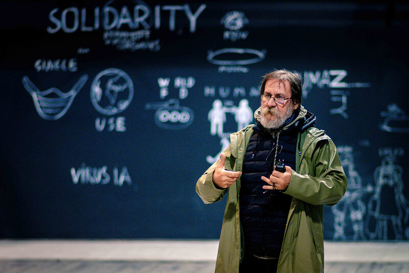 „Ich weiß nicht, ob das eine Retrospektive oder ein Anfang ist“, sagt der Künstler. „Aber es ist der Ort, an dem ich mein ganzes Leben sehen kann – gezeichnet in Weiß auf Schwarz (Anm. d. Red.: Die Hallenwände sind schwarz gestrichen).“ Es ist eine lebendige Retrospektive, ein bewegliches Archiv, und ein sechs Meter langes CV zeigt, dass jede Stunde dieser 40 Jahre mit Arbeit gefüllt war: „Es ist eine visuelle Biografie, aber auch ein Beweis für Durchhaltevermögen. Man merkt gar nicht, wie die Zeit vergeht“, gesteht Perjovschi. „Ich habe 1985 angefangen und hoffe, am letzten Tag der Ausstellung im Jahr 2025 anzukommen. Dann kommen die Jungs und überstreichen alles. Aber bis sie kommen, zeichne ich noch ein bisschen weiter“, scherzt er.