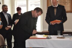 Das Thema, welches für das Ordinationsgespräch festgelegt wurde, lautete: „Die Bedeutung der Mission der Kirche gemäß des Augsburger Glaubensbekenntnisses Art. 7, mit Berücksichtigung des Bukarester Missionskodex auf dem Weg eines strategischen missionarischen Wirken der Evangelischen Kirche A.B. in Rumänien unter Beachtung des Missionsbefehls in Matthäus 28, 16-20.“ Zu diesem Thema hatten die vier Kandidaten jeweils fünfzehn Thesen ausgearbeitet, die als Grundlage für das Gespräch dienten. Nachdem die Ordinanden den griechischen Bibeltext übersetzt hatten, konnten diese anhand der Fragen, die Bischof Guib ausgehend von den einzelnen Thesen an sie richtete, unter Beweis stellen, wie sehr sie mit den Strukturen, den Fragestellungen, den Aufgaben und der besonderen Problematik der EKR als Minderheitskirche vertraut sind. Zugleich wurden sie aufgefordert, auch die eine oder andere Zukunftsvision, ausgehend von ihrer bisherigen Erfahrung als Studenten und Vikare, vorzulegen. Nach dem fast eineinhalbstündigen Gespräch, in welchem die Ordinanden durch ihre Antworten zur allgemeinen Zufriedenheit gezeigt hatten, dass sie für den geistlichen Dienst vorbereitet sind, unterschrieben sie der Reihe nach das Ordinationsbuch der EKR, wodurch sie ihre Verpflichtung für das Glaubensbekenntnis der Kirche und ihre Bereitschaft, den geistlichen Dienst anzutreten, bestätigten.