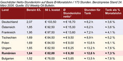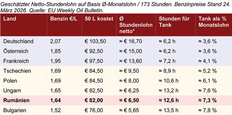 Ein Rumäne arbeitet für einen vollen Tank (50 Liter) rund 12,6 Stunden – doppelt so lange wie ein Deutscher oder Österreicher. Während ein Vollzeitarbeitnehmer in Deutschland für denselben Tank 3,6 Prozent seines Monatslohns aufwendet, sind es in Rumänien 7,3 Prozent. Rumänien steht damit schlechter als Polen und nur knapp besser als Bulgarien, das jedoch eine deutlich geringere Steuerbelastung auf Kraftstoff aufweist, da.