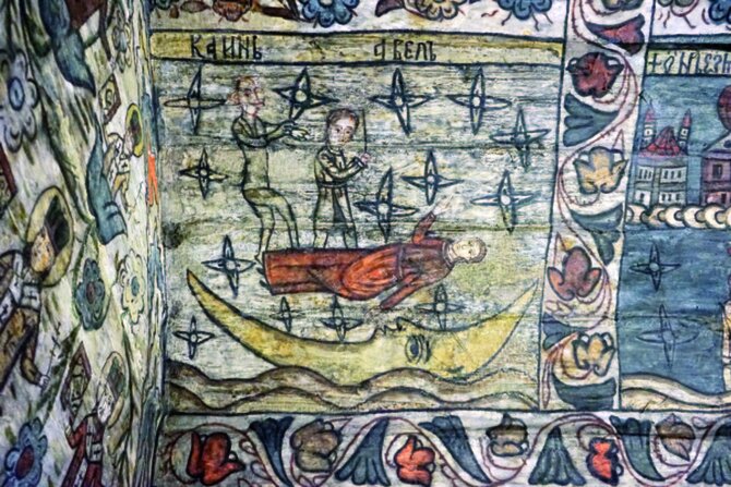 In der Holzkirche von Desești: Eine Mondsichel schwimmt als Schiffchen auf sternenübersätem Gewässer. Darauf liegt ein Mann, über dem zwei Figuren schweben: die eine hält einen Stern in der Hand, die andere einen Stab. Rogoz:... [mehr]