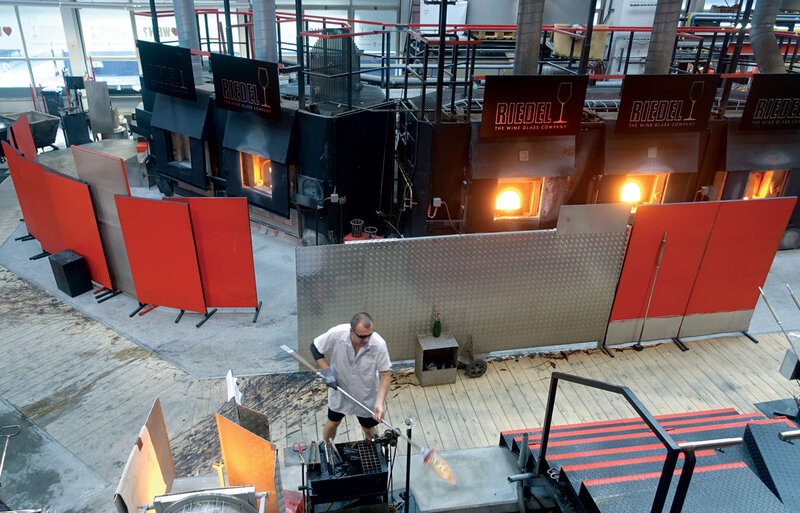 Wer hautnah erleben möchte, was und wie Riedel heute produziert, besucht am besten die Werkshallen in Kufstein. Claus Josef Riedel erkannte, dass die schweren Bleikristall-Weingläser aus Böhmen dem leichten, modernen skandinavischen Design weichen mussten: Der Zeitgeschmack hatte sich gewandelt. Zudem konnte er bestätigen, was die wirklichen Weinkenner schon lange wussten: Der gleiche Wein schmeckt in verschiedenen Gläsern ganz anders, sodass es optimale Glasformen für jeden Wein sorgfältig zu finden galt. Die Produktionsweise von Glas hat sich nicht wesentlich verändert: Vier bis fünf Glasmacher sind allein schon mit der direkten Produktion jedes einzelnen Glases beschäftigt; von der Vorbereitung des Gemenges bis zur Auslieferung sind es mindestens fünfzehn Stellen. Die Glasmasse wird in sogenannten Hafenöfen bei 1440 Grad geschmolzen, dann auf 1200 Grad reduziert. Mit der Glasmacherpfeife entnimmt der Kölblmeister die benötigte glühende Glasmenge aus dem Hafenofen. Vom Einbläser wird sie durch dauerndes Drehen im Wulgerholz vorgeformt und danach in die Form eingeblasen. Die Einblasform bestand ursprünglich aus Birnenholz, die 350 Mal verwendet werden konnte. Heute nimmt man Formen aus Alu, die innen mit Birnenholzkohle beschichtet sind. Der Glasmachermeister übernimmt nun den ausgeblasenen Kelch, und der Umdreher hält die Stelle für den Stiel heiß. Der Kaier übergibt dem Glasmachermeister einen Tropfen Glas. An der richtigen Stelle platziert, zieht dieser daraus den dünnen Stiel – die heikelste Arbeit. Ein weiterer Tropfen Glas wird von ihm mit der Bodenschere zur Bodenplatte geformt. Zuletzt bringt der Umdreher die Gläser zur Kühlbahn. Jeder Handgriff muss zu jeder Sekunde auf den Millimeter genau sitzen – so lässt sich ersehen, dass mundgeblasenes Glas durch so vieler Hände Arbeit seinen Wert und auch seinen Preis hat. 200.000 mundgeblasene Gläser gehen im Jahr aus Kufstein und 56 Millionen maschinell gefertigte von Amberg und Weiden.