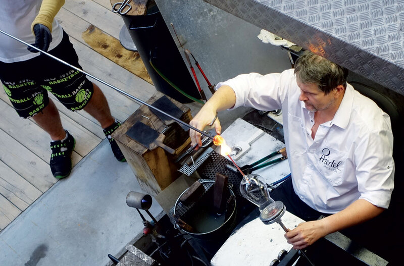 Ein weiteres bemerkenswertes Produkt in Kufstein ist der Dekanter. Von der einfachen Glasflasche wurde er zu dreißig Grundformen entwickelt, die jeder Glaskünstler frei formend weiterentwickeln kann.