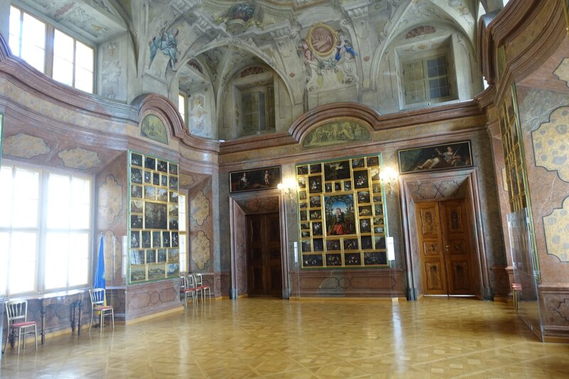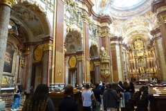 Eine solche Ausdehnung eines Gebäudes macht stolz, aber auch Sorgen, denn das alles muss ja auch erhalten werden. Seit Jahrhunderten packen es die Melker Mönche an und erhalten dieses Juwel, das auch Unfromme stolz macht auf österreichische Kunst und Kultur. Aus der Unmenge von Kunstwerken fällt es schwer, auch nur die wichtigsten hervorzuheben: die Stiftskirche (mit dem Grab des heiligen Koloman und dem Grabmal der ersten Babenberger); die Bibliothek, die aus zwölf Räumen besteht und 130.000 Bücher beherbergt (davon 750 Inkunabeln und 1800 wertvolle Handschriften, die älteste aus dem frühen 9. Jahrhundert), links und rechts in den Fensternischen zwei große Globen, ein Erdglobus und ein Himmelsglobus aus dem 17. Jahrhundert; der Marmorsaal, ein ehemaliger Repräsentations- und Speisesaal für Gäste (teils mit Untersberger-, hauptsächlich aber mit Stuckmarmor ausgekleidet); die Altane, eine Terrasse, die den Marmorsaal mit der Bibliothek verbindet (und die während der Restaurierung 2025 temporär für die Besucher überbrückt wurde, wodurch für sie der grandiose Ausblick ins Donautal erhalten blieb); die Kaiserstiege und der 196 Meter lange Kaisergang, in dem die lebensgroßen Gemälde aller Herrscher der Babenberger und der Habsburger hängen; der Spiegelsaal mit kostbaren Kelchen und Monstranzen wie der Kolomani-Monstranz (mit der Reliquie des Unterkieferknochens des hl. Koloman); der gotische Flügelaltar von Jörg Breu (1502), der eine sehr dynamische Darstellung von Jesu Leidensweg zeigt. Der größte Schatz, das Melker Kreuz (ein kostbares Reliquiar aus Gold und Edelsteinen) wird separat aufbewahrt und kann im Stiftsmuseum als Nachbildung besichtigt werden. Das Original wird an besonderen Feiertagen in der Stiftskirche gezeigt.